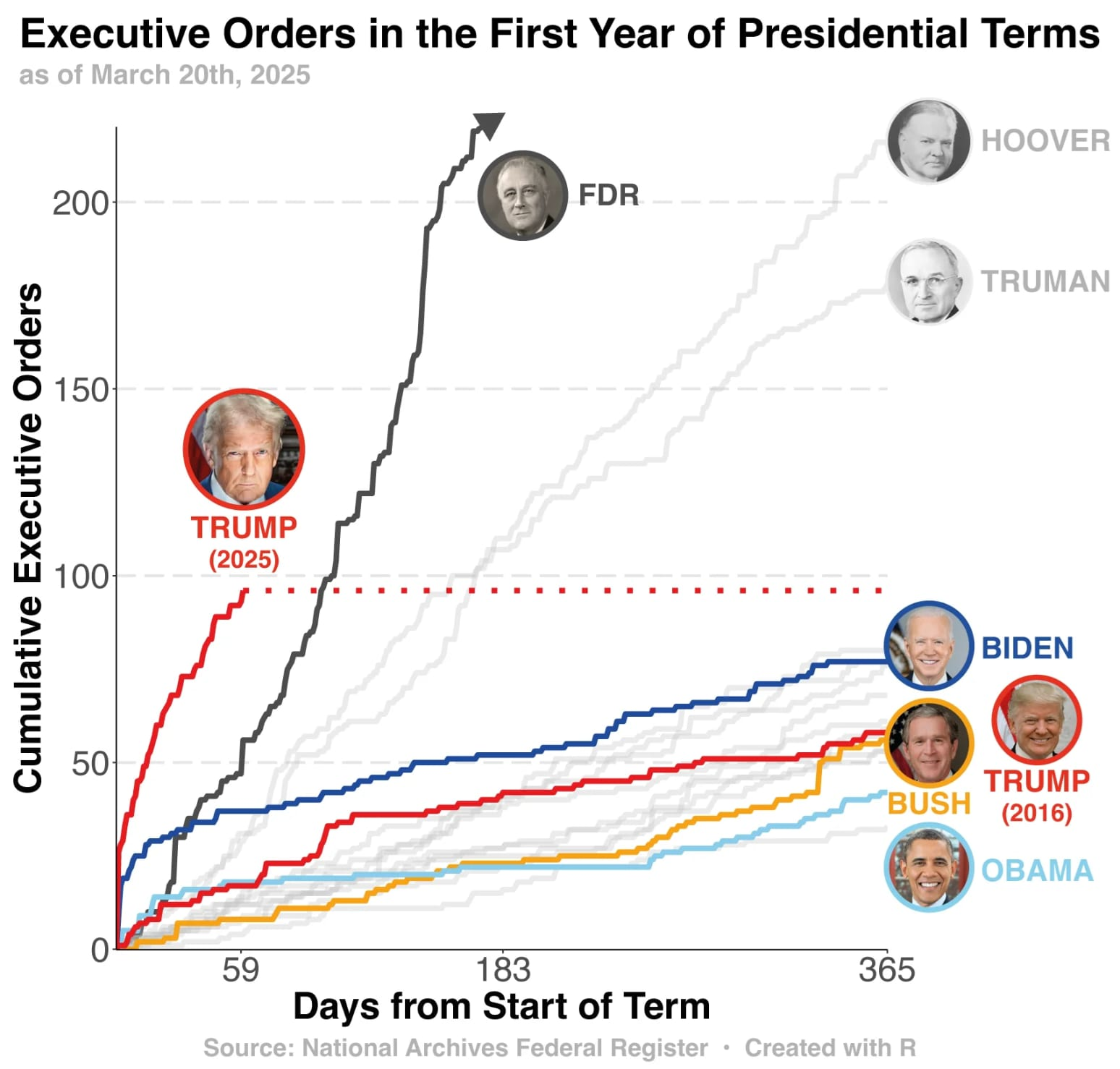 2025년 도널드 트럼프 대통령의 재임 2기 출범 이후, 행정명령 발동 속도와 강도가 미국 정치사에 전례 없는 수준으로 기록되며 화제입니다. 3월 초 기준 88건의 행정명령 발표는 역대 대통령 중 프랭클린 D. 루즈벨트(FDR)에 이어 두 번째로 높은 연간 추세를 보이고 있습니다.